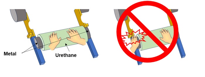 ・When transferring the main roller from the lifter to the rail (cradle), firmly hold the center of the urethane section with both hands.