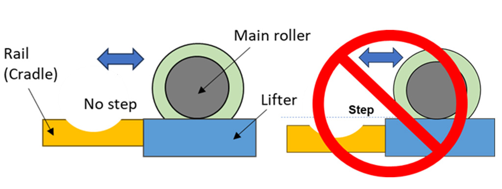 ・If the height of the main roller lifter and the rail (cradle) do not match, adjust the height of the lifter.